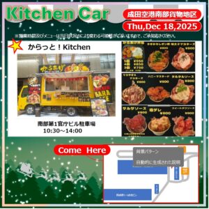 2025/12/16 12月18日 年内最後のキッチンカー! こんにちは! 成田国際空港貨物営業部から 年内最後のキッチンカーのお知らせが届きました! 成田空港からの軽貨物配送はオーシャンにお任せください!